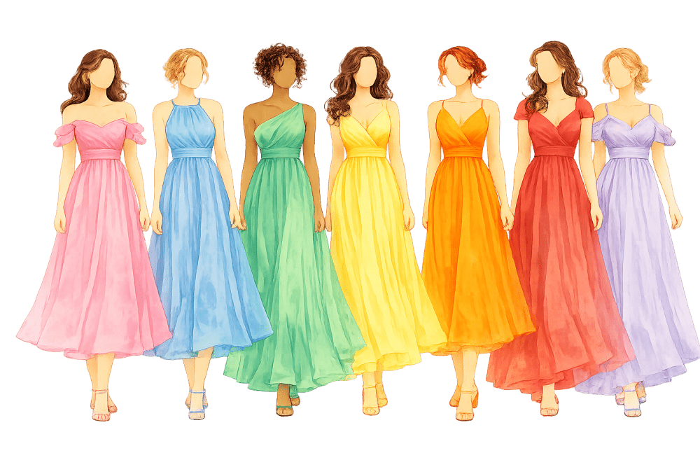 Para elas, sugerimos vestidos leves e fluidos, em comprimentos midi ou longos, com cores vibrantes ou estampas que tragam leveza e alegria. Escolha o que mais combina com você!